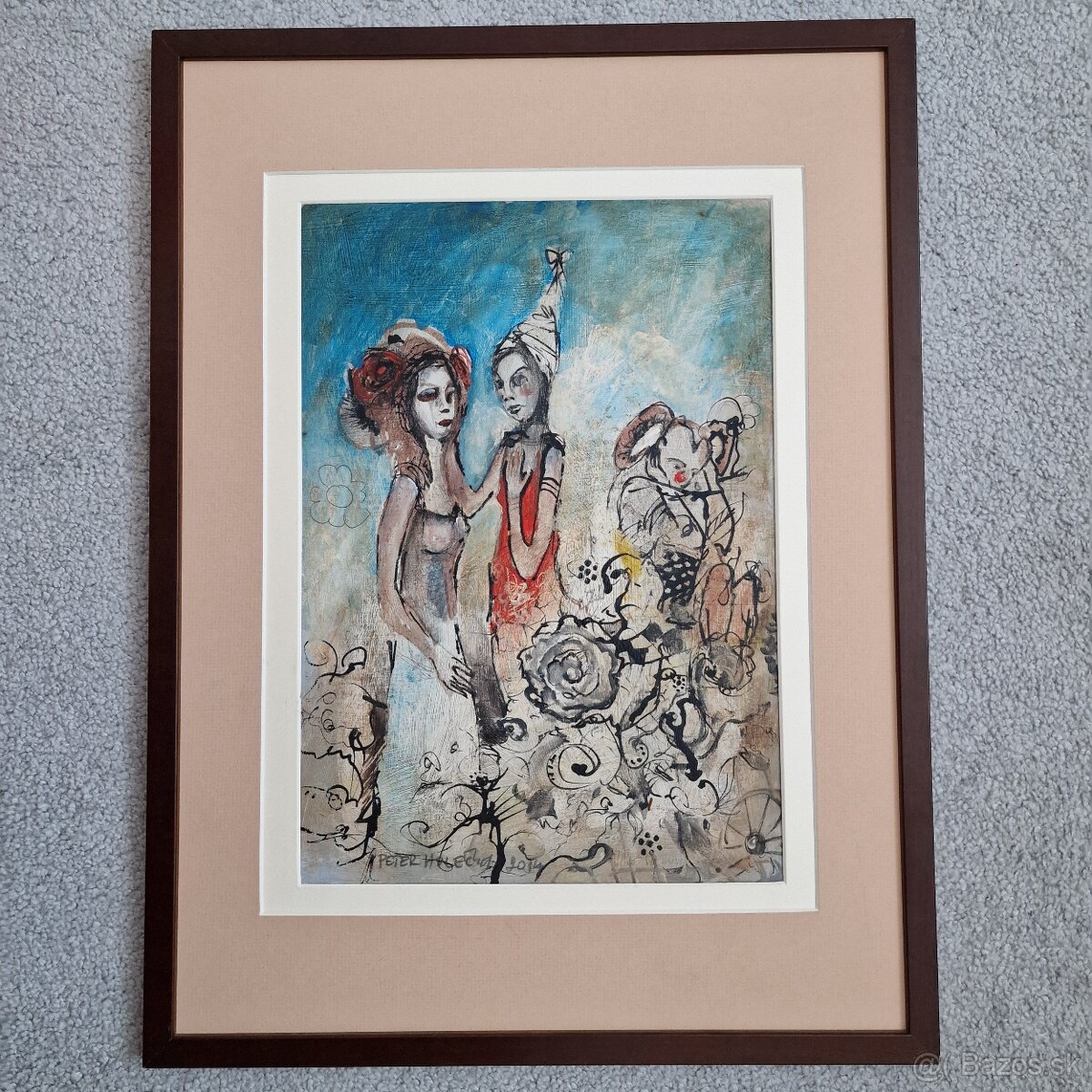 Predám originál obraz od Peter Holečka s názvom Vaše Starosti z roku 2014. Jedná sa o kombinovanú techniku.