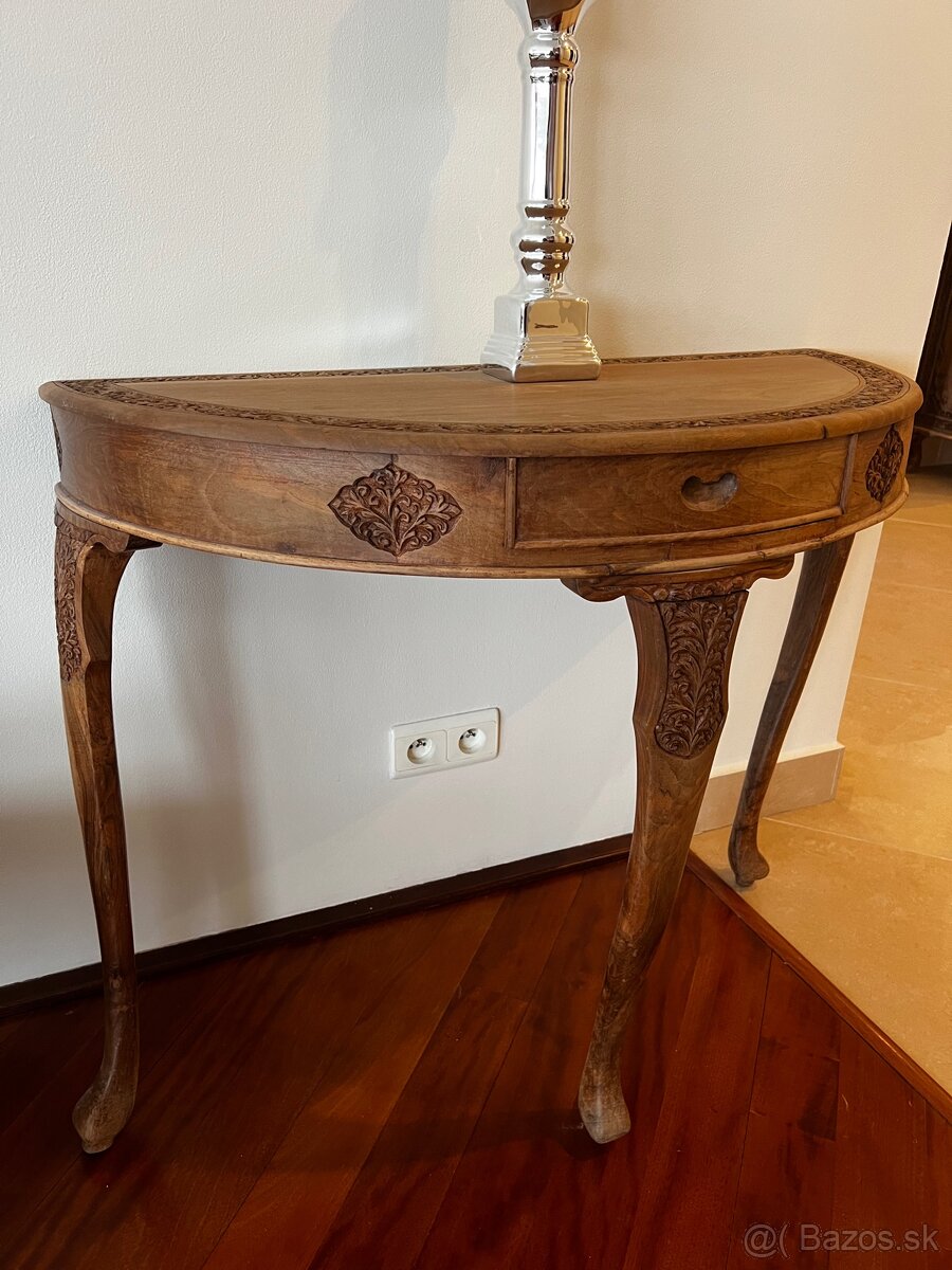 vyrezávaný polkruhový konzolový stolík v tvare polmesiaca je vyrobený z masívneho dreva a vyznačuje sa elegantnými nohami a dekoratívnymi prvkami.
