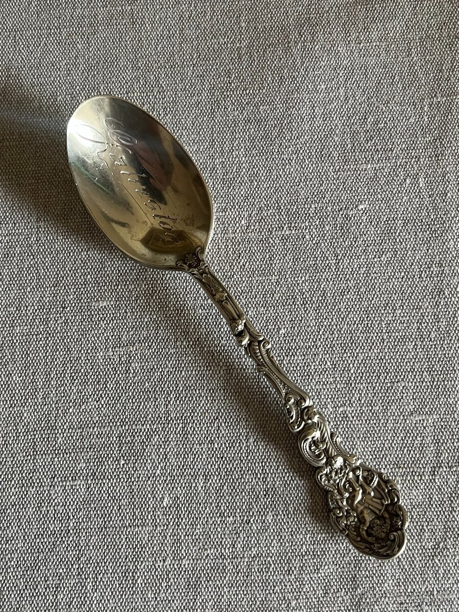 Predám striebornú čajovú lyžičku. Váha 34 gramov, dĺžka 14,5 cm. Rúčka bohato zdobená - na vrchu anjelik s harfou a zo spodnej strany rúčky monogram D. V lyžičke vyryté slovo Galveston. Značené neznámym, asi americkým puncom.