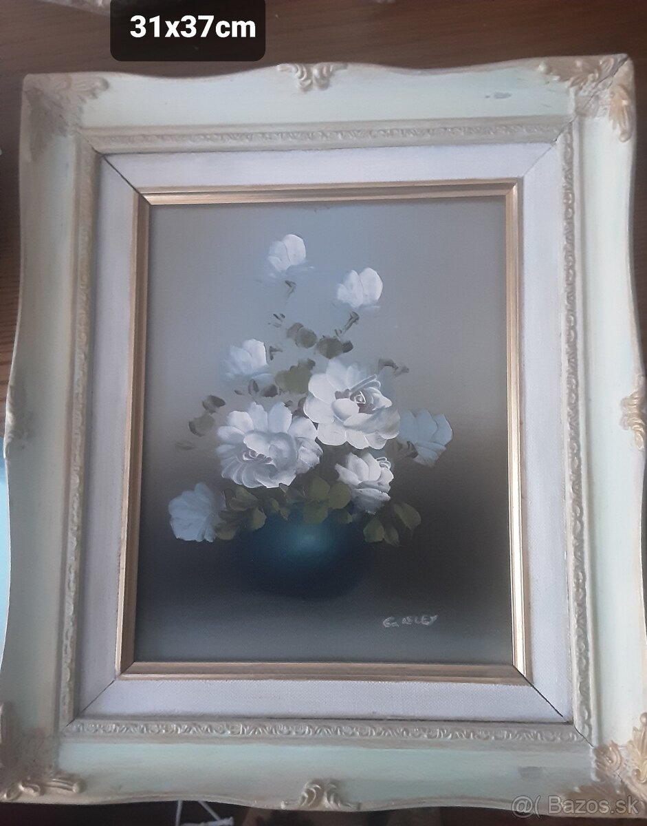 Ponúkam na predaj olejomaľbu bielych kvetov vo váze v ráme rozmeru 31x37cm a 4kusov kópií portrétov v cene 35€ za kus.