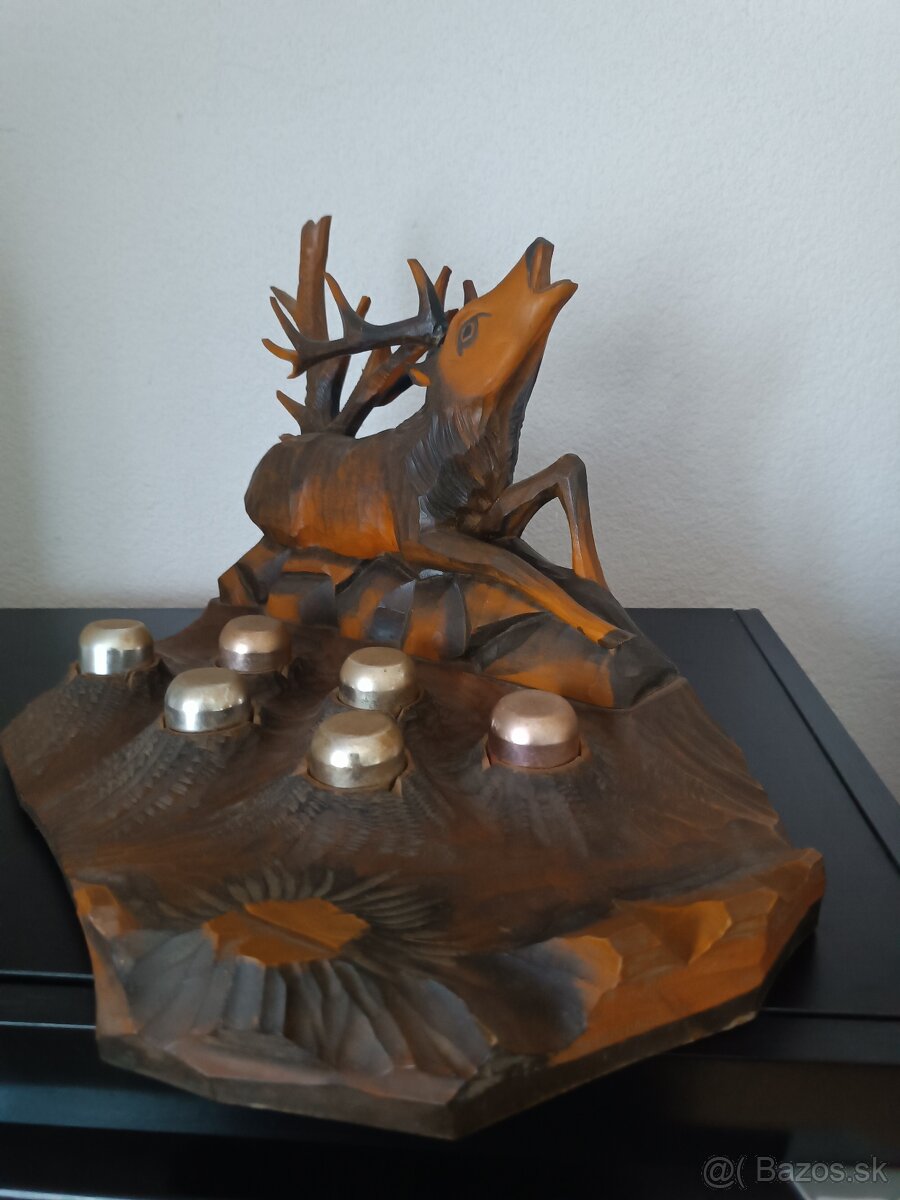Predám rezbu jeleň z pohárkami v-26 cm d-43 cm s-22 cm cena 50€ sova breza kôra v-26 cm d -28 cm cena 15€