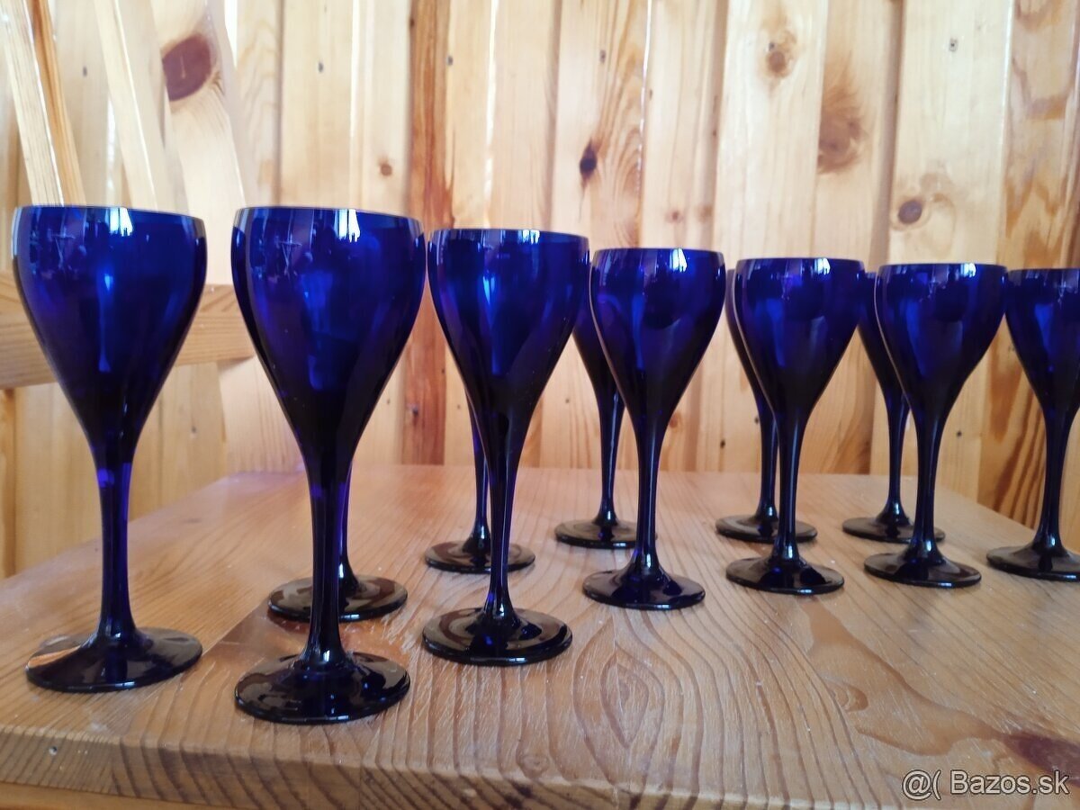 Dve sady pohárikov z 90-tych rokov z kobaltového skla, vitrínový stav, výška 12 cm, objem 0,3dcl sada 6ks