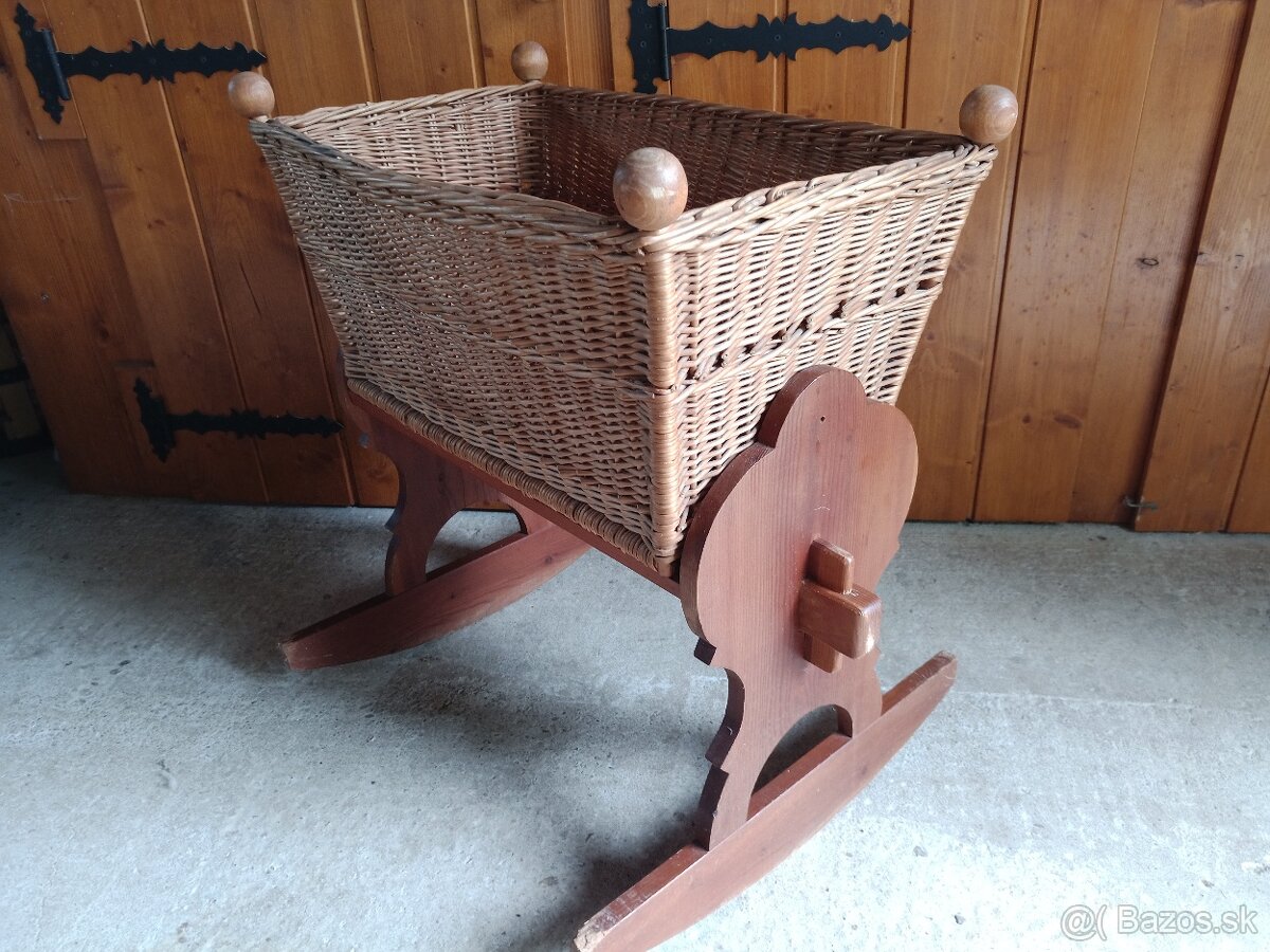 Stará detská kolíska z masívu a prútia vo výbornom stave. Rozmer celková výška 74 cm, šírka spodok 60 cm. Rozmer koša dĺžka 71 cm, šírka 42 cm, hĺbka 32 cm. Cenu ponúknite cez SMS. Osobný odber.