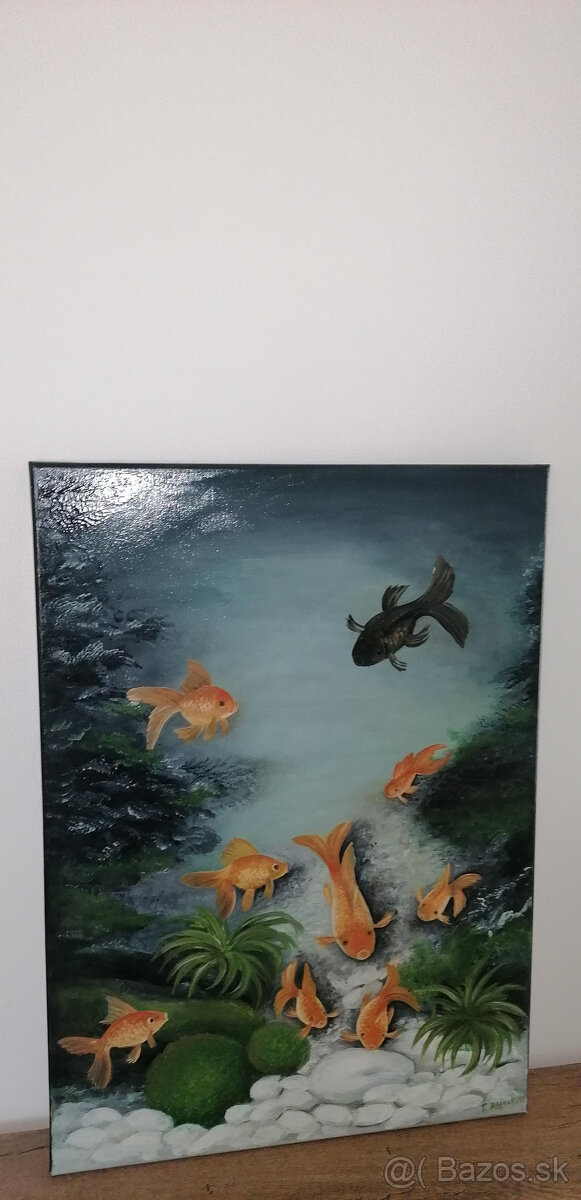 Predám Custom made Olejomaľba 50cm x 70cm bez rámu, 8 rybičiek – znamenie feng-shuej,