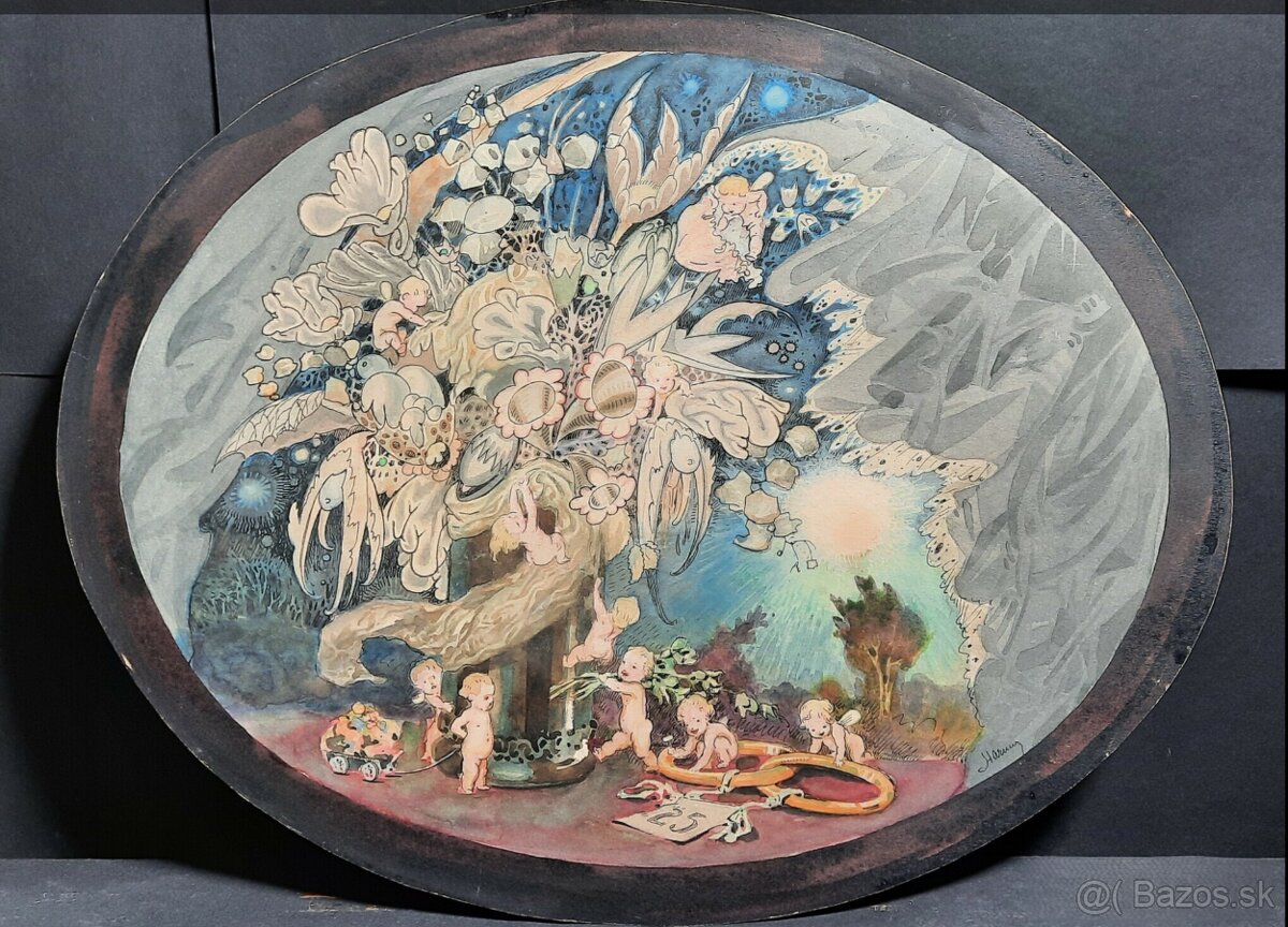 Kombinovaná technika od Karola Harmosa v jeho typicky bohatom, symbolisticky poňatom akvarelovo-tušovom prevedení, pravdepodobne k 25. výročiu sobáša pre jedného zo svojich mecenášov. Nerámovaný voľný list tenkého kartónu.