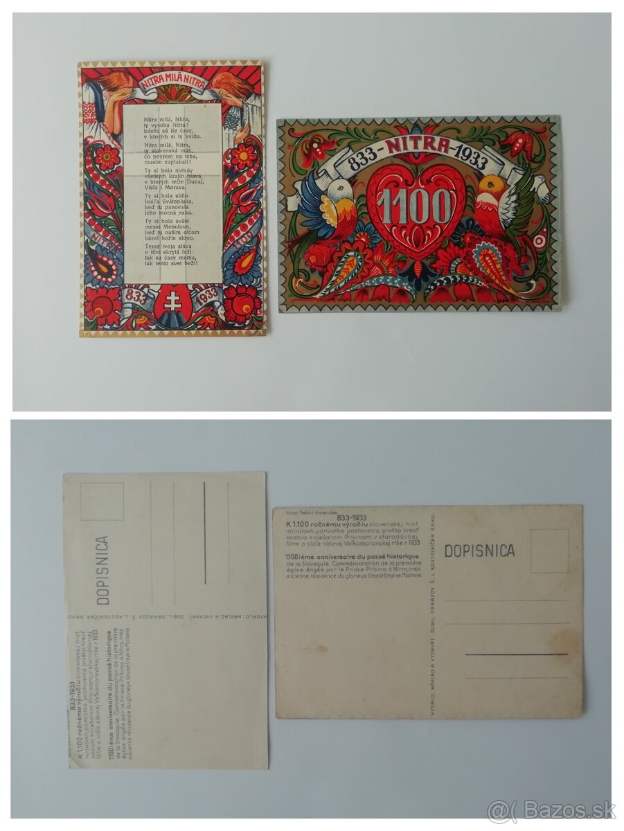 Dopisnice vydané k 1100 výročiu slovenskej hist. minulosti. Vydalo nakladateľstvo Jubil. obrazov Š.L. Kostelníčka, Brno. Neprešlé poštou. Platba vopred na účet, cena+ poštovné, cena je za 2 ks. Na dobierku neposielam. Ponuky, dotazy na mail.