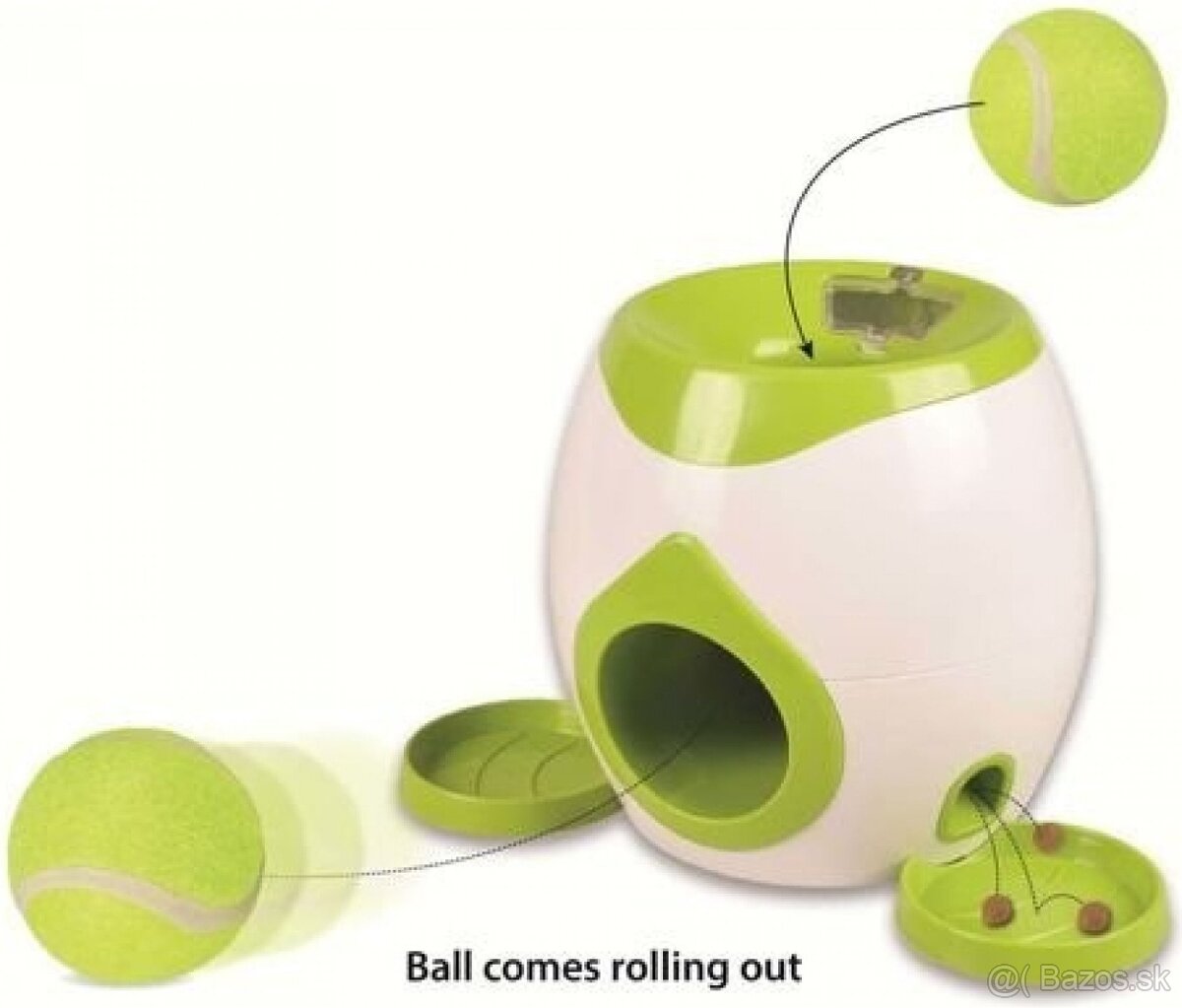 Interaktívna hračka pre psov, ktorá psa zabaví aj bez vašej prítomnosti. Namiesto vám bude pes aportovať tenisák hračke a tá ho vždy za prinesenú loptičku odmení maškrtou. Stačí len do hračky nasypať maškrty (maximálny priemer pamlsku 12,5 mm). Pes určite rýchlo pochopí, kam má loptičku hodiť, aby mu vypadla odmena. Akonáhle tenisák vhodí do horného otvoru (spodným sa vykotúľa), do mištičky mu vypadne maškrta. Hračka funguje bez bateriek. Súčasťou je lopatka na maškrty i loptička.