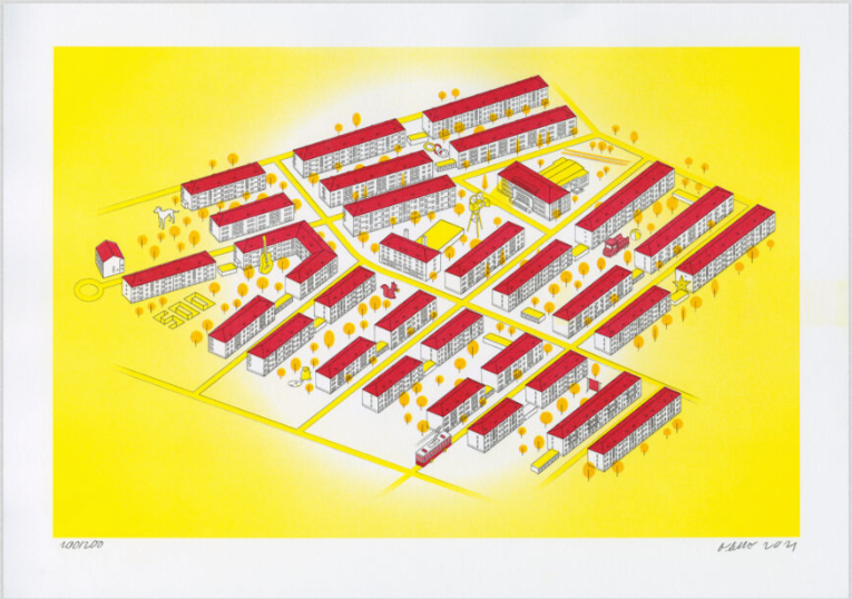 Dielo dizajnérky Martiny Obertovej zobrazuje prvú bratislavskú obytnú štvrť z 50. rokov. V prvotnej fáze výstavby, ale so súčasným životom. Trojposchodové tehlové domy boli postavené v rýchlosti v povojnovom období. Zeleň a ihriská dokončovali samotní obyvatelia v rámci budovateľskej Akcie Z. Kultúrny dom otvorili až v roku 1965 premietnutím švédskeho filmu Krátke leto. Vďaka príjemnej mierke a množstvu zelene patria tieto rané socialistické štvrte medzi obľúbené po celom Slovensku. Je dôležité ustriehnuť ich meniaci sa vzhľad. Aby si pri rozvoji zachovali čo najviac svojej autentickosti. Grafika bola ponúknutá priamo obyvateľom 500 bytov.