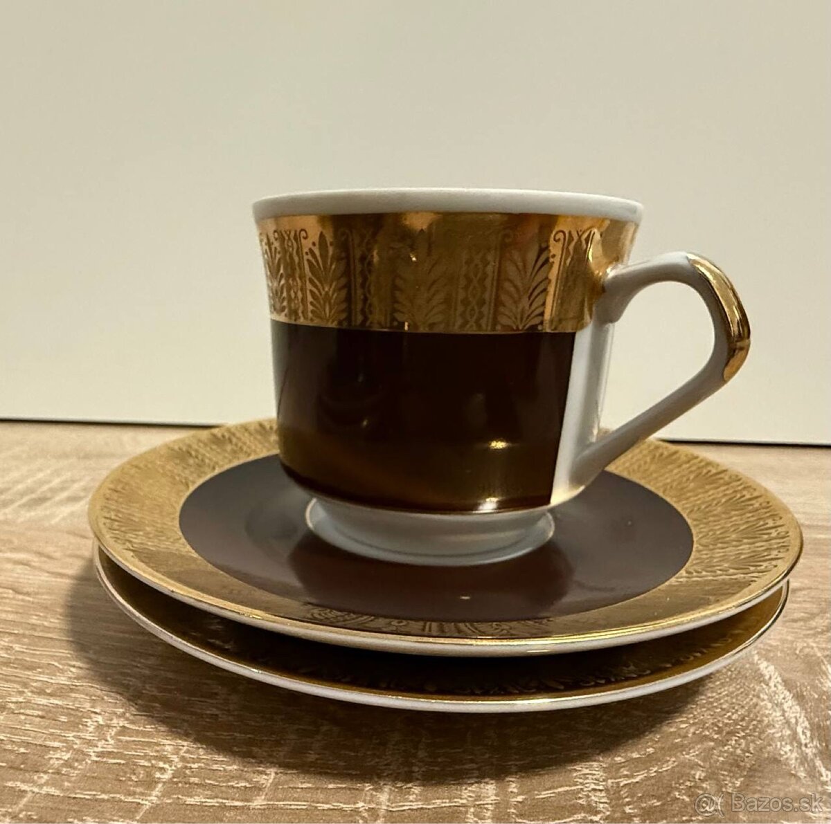 Čajová súprava. 6 vzorovaných šálok a podšálok čokoládovej farby so zlatým lemom. Výroba porcelánky Bohemia Nova Rol, druhá polovica 20. storočia. Veľmi dobrý stav, bez škrabancov a žmolkov. Objem 150 ml, výška 6,5 cm, priemer vrchnej časti 7 cm, podšálka 13,5 cm.
