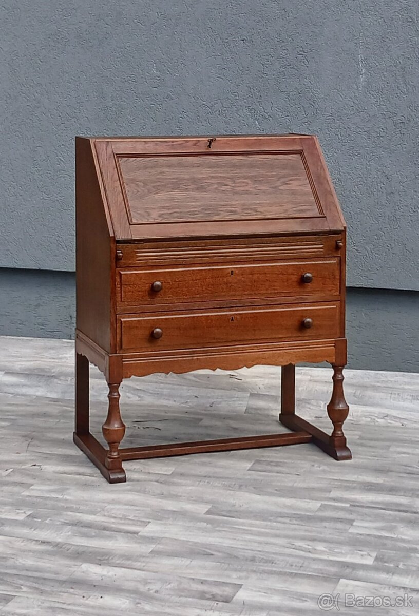 Tento elegantný celodrevený dubový písací stôl s nadstavbou ( sekretár) v klasickom štýle spája historický šarm s praktickým úložným priestorom. Bude ideálnym kúskom pre milovníkov starožitného dizajnu a koloniálneho štýlu. Je postavený na vyvýšenej podnoži so štyrmi vysústruženými nohami, ktoré sú v spodnej časti prepojené pevnou trojnožou v tvare písmena „H“. Tento detail mu dodáva stabilitu a odľahčený elegantný vzhľad. Dominantou je výklopná doska, ktorá po otvorení slúži ako písacia plocha. Vnútro dosky je čalúnené tmavozelenou látkou , čo poskytuje mäkký povrch na písanie a chráni drevo pred poškriabaním. Po vyklopení hlavnej dosky sa odhalí systém malých otvorených priehradiek, drobných zásuviek a centrálnej skrinky, ktoré sú ideálne na triedenie korešpondencie, pier a drobných predmetov. Pod písacou plochou sa nachádzajú dve priestranné zásuvky s ozdobnými okrúhlymi úchytkami, vhodné na odkladanie dokumentov , alebo kancelárskych potrieb. Vďaka svojmu kompaktnému dizajnu sa bude hodiť do pracovní, obývacích izieb , alebo aj do spálne ako štýlový toaletný stolík. Používaný . Výška – 105 cm , šírka – 80 cm , hĺbka – 52 cm .Dovoz Holandsko. Dovoz až k Vám domov viem v rámci Slovenska zabezpečiť po dohovore zadarmo . Pozrite všetky moje inzeráty možno zaujme aj niečo iné. Uprednostňujem telefonický kontakt pred sms a emailmi. Všetko je o dohode .