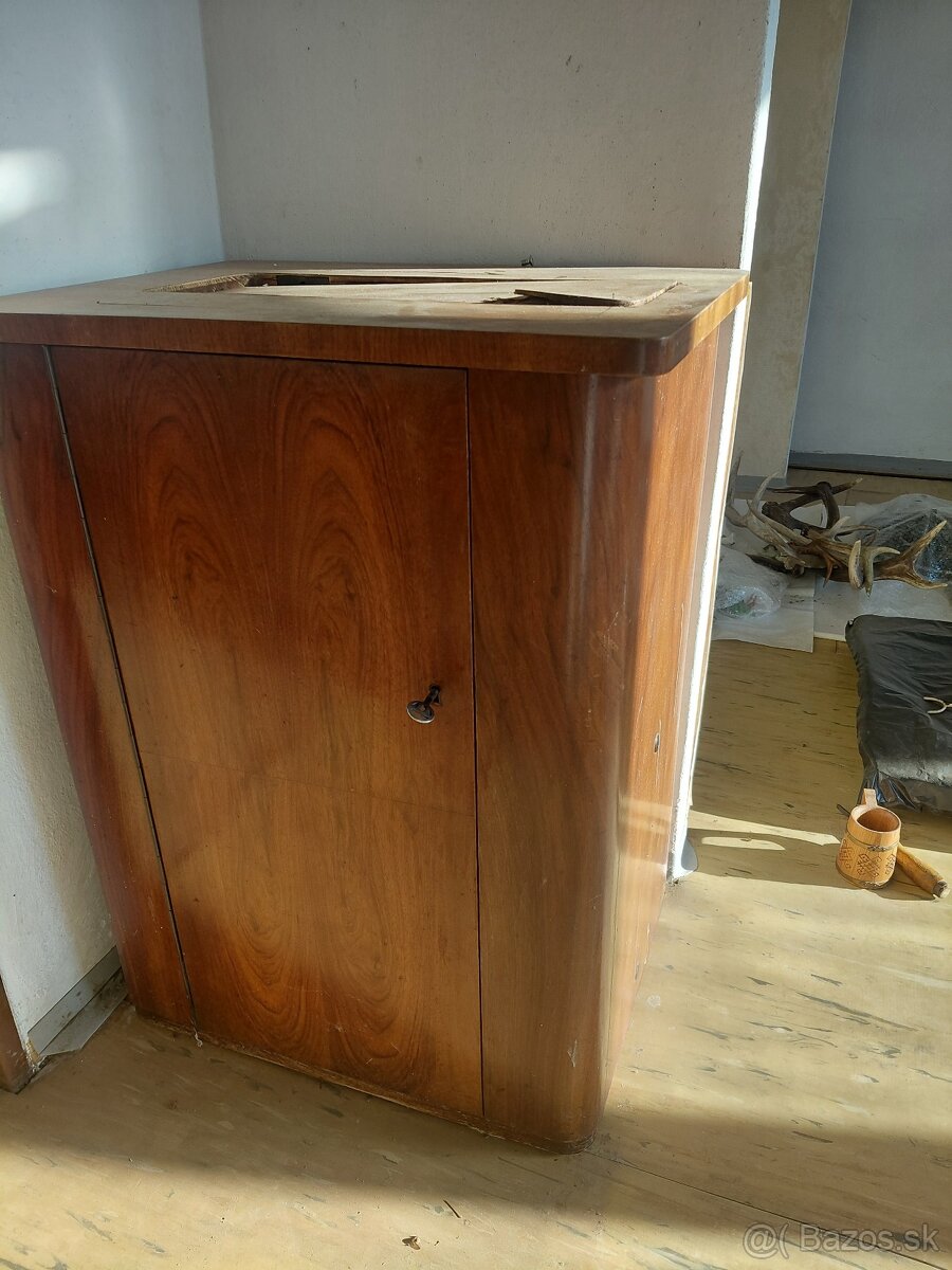 • drevená skrinka je zachovalá, vrchná doska je poškodená (viď foto)